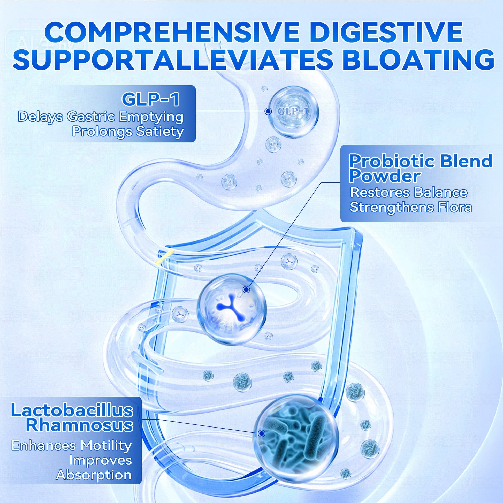 GLP-1 suppresses appetite, delays gastric emptying, and enhances insulin sensitivity, improving glucose and lipid metabolism at its source. The probiotic blend, paired with xylooligosaccharides, forms a synbiotic system that restores gut microbiota balance and promotes short-chain fatty acid production, thereby improving insulin response and lipid metabolism. Lactobacillus rhamnosus further regulates blood sugar and enhances immunity at the intestinal level, forming a synergistic metabolic control mechanism with GLP-1.